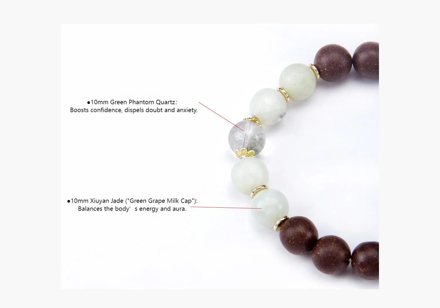 - 10mm Green Phantom Quartz – Boosts confidence, dispels doubt and anxiety.